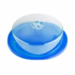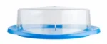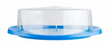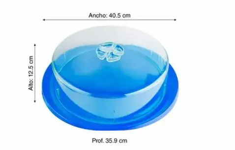 Envase contenedor de tortas. Consta de dos partes: cuerpo con forma de plato, y la tapa con forma de cono truncado con hendiduras en la base para levantar.